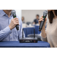 調整接收機與擴大機音量即可使用。麥克風也可以調整音量;建議收音距離 4–8cm、斜角約 45°。